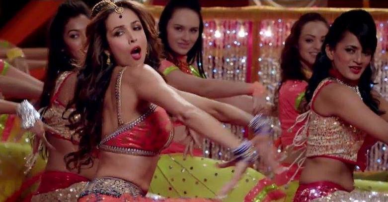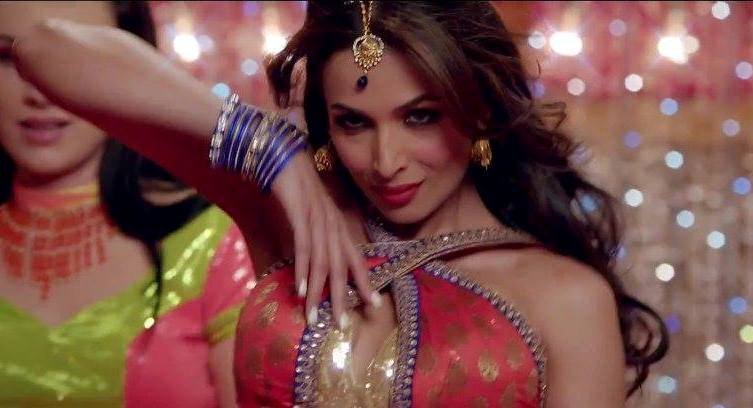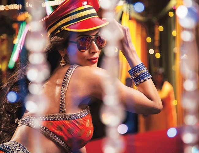 In the song Malaika is wearing bright orange lehenga and looking an absolute stunner. She adds a hint of sexiness sporting mirror shade aviators and a band cap.